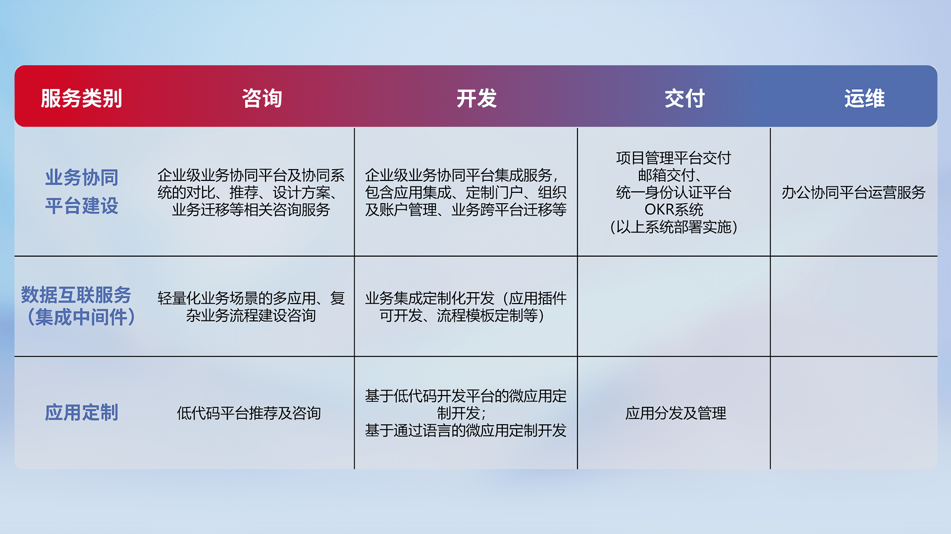 针对钉钉、、、企微、、IDaas等平台级产品提供产品的规划、、、方案、、、交付、、、、定制化开发等服务,,实现如统一协同办公、、、、智能客户服务、、、、混合会议管理、、、智能数据查询、、、等业务场景,,,,实现数字化转型。。。